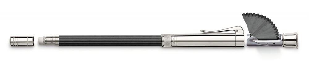 Perfect Pencil od Graf von Faber Castell je elegantní černá grafitová tužka s víčkem pokoveným platinou se zabudovaným ořezávátkem, které chrání grafitovou tuhu na jejím ořezaném konci. Ve víčku najdete i gumu. Platinou pokovené části jsou leštěny do zrcadlového lesku. Tužka je vyrobena z jemně žebrovaného cedrového dřeva z Kalifornie. Dodávané v luxusní dřevěné dárkové krabičce.